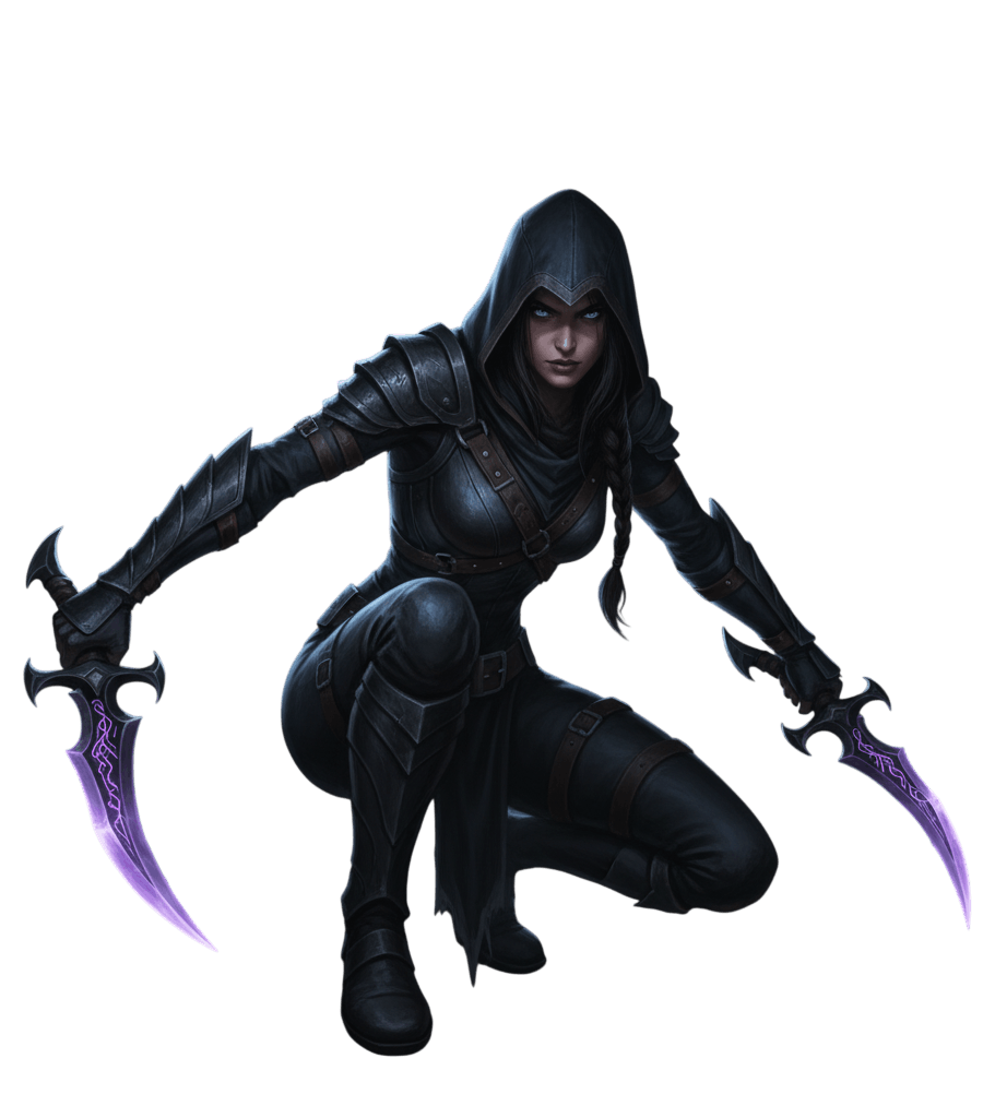 Fast, deadly, and unseen, Assassins eliminate targets before they know danger is near. Masters of stealth and precision, they specialize in swift strikes, poisons, and deadly escape tactics.